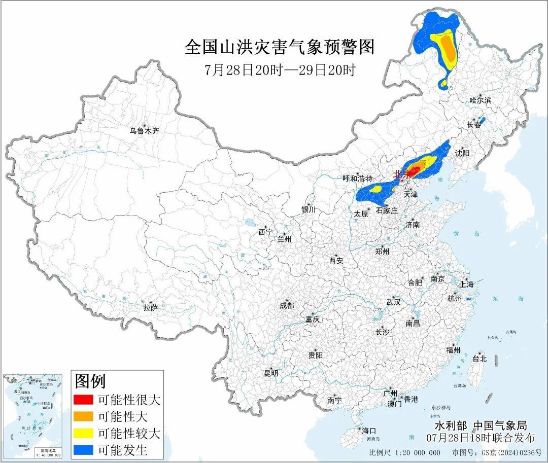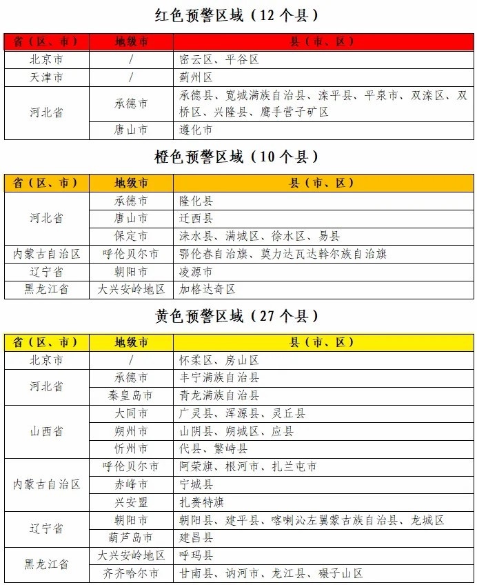 據(jù)“中國水利”微信公眾號消息,水利部和中國氣象局7月28日18時(shí)聯(lián)合發(fā)布紅色山洪災(zāi)害氣象預(yù)警:預(yù)計(jì),7月28日20時(shí)至7月29日20時(shí),北京東部、天津北部、河北中部和東北部、內(nèi)蒙古東北部、遼寧西部、黑龍江西部等地部分地區(qū)發(fā)生山洪災(zāi)害可能性大(橙色預(yù)警),其中,北京東部、天津北部、河北東北部局地發(fā)生山洪災(zāi)害可能性很大(紅色預(yù)警),預(yù)警區(qū)域涉及的縣(市、區(qū))見下表。其他地區(qū)也可能因局地短歷時(shí)強(qiáng)降水引發(fā)山洪災(zāi)害,請各地注意做好實(shí)時(shí)監(jiān)測、防汛預(yù)警和轉(zhuǎn)移避險(xiǎn)等防范工作。