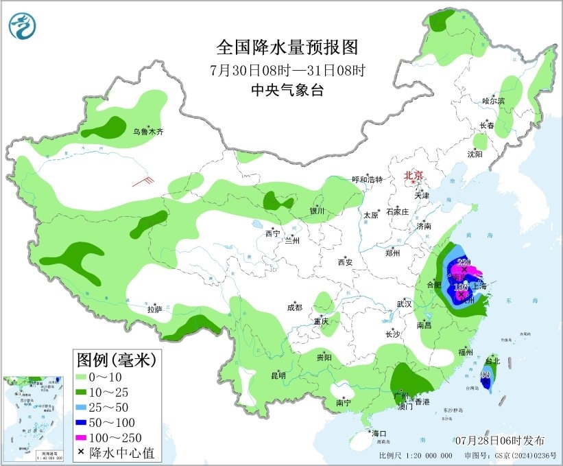 7月29日08時(shí)至30日08時(shí),內(nèi)蒙古東北部、黑龍江北部、吉林中部、遼寧北部、江蘇南部、上海、浙江中東部、臺灣島中南部、廣東南部等地的部分地區(qū)有大到暴雨,其中,浙江中東部等地的部分地區(qū)有大暴雨(100~200毫米)。內(nèi)蒙古東部有4~5級風(fēng)。東海大部海域、臺灣以東洋面偏南海域、巴士海峽將有7~8級、陣風(fēng)9級的西南風(fēng),臺風(fēng)中心經(jīng)過的附近海域風(fēng)力可達(dá)9~10級、陣風(fēng)11~12級。