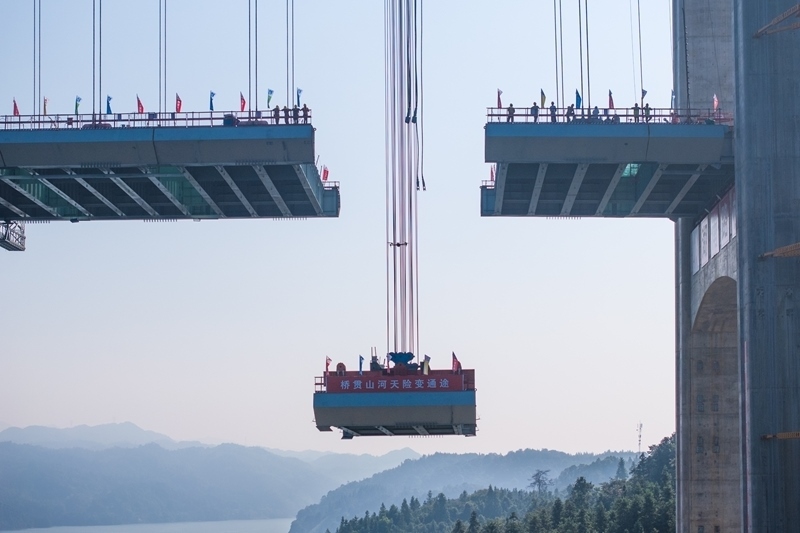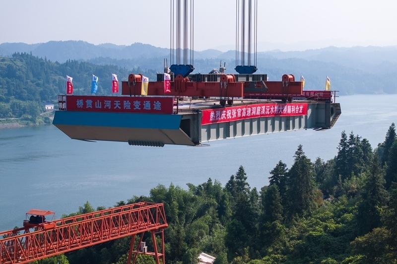 8月3日,在張官高速洞庭溪沅水特大橋施工現(xiàn)場(chǎng),一塊鋼混結(jié)合梁在被緩緩提升(無人機(jī)照片)。
