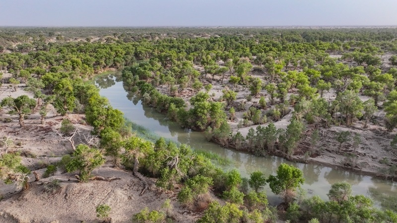 8月6日,在新疆巴音郭楞蒙古自治州尉犁縣境內(nèi)拍攝的胡楊林(無人機照片)。