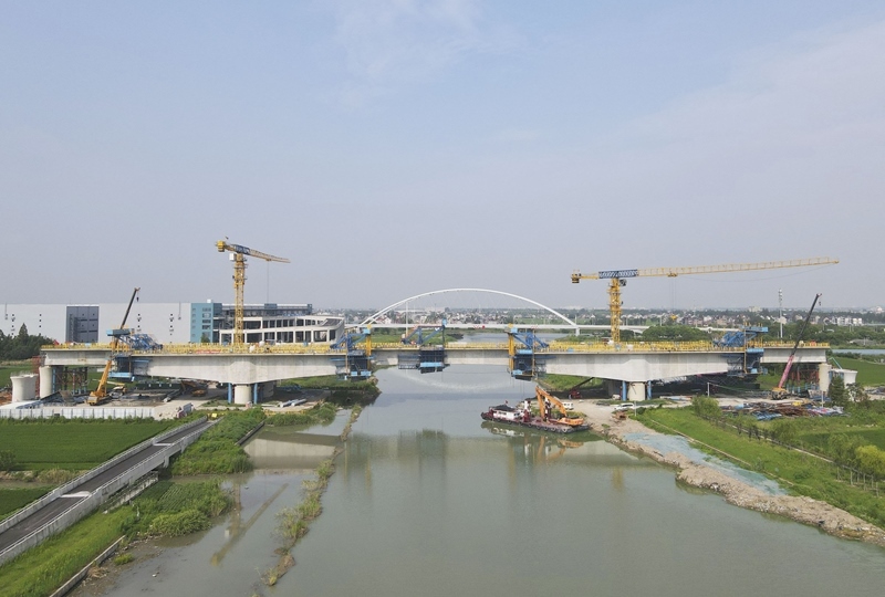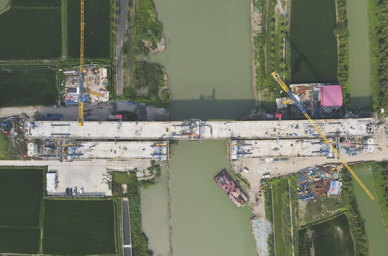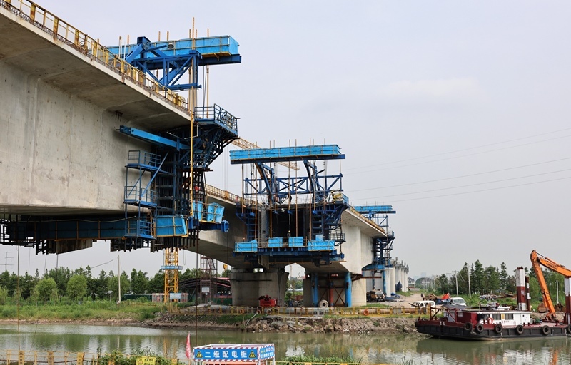 8月12日拍攝的滬寧合高鐵上海特大橋跨羅蘊(yùn)河連續(xù)梁施工現(xiàn)場(無人機(jī)照片)。