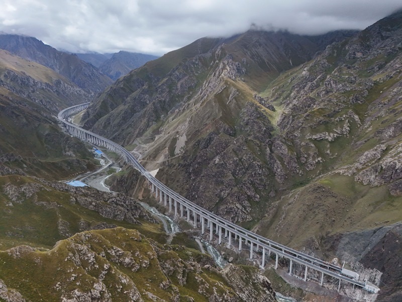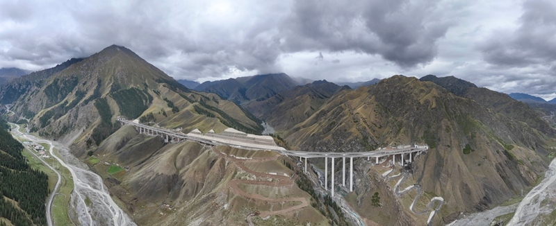 新疆烏尉高速公路穿越天山山脈(8月19日攝,無人機全景照片)。