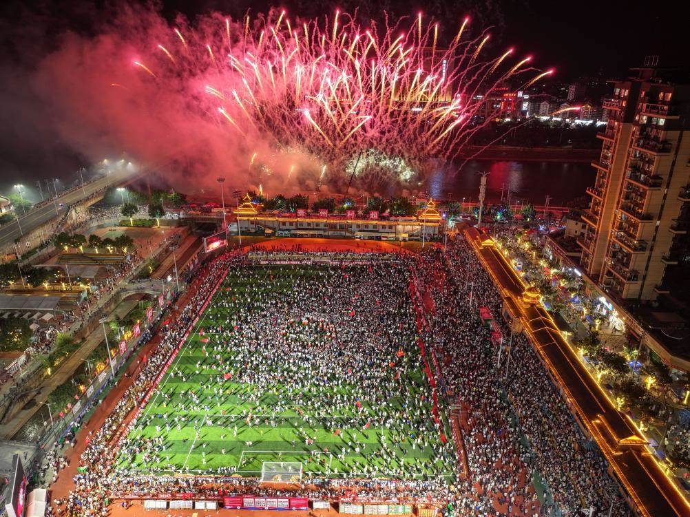 7月26日,貴州“村超”球場(chǎng)拍攝的煙花秀(無人機(jī)照片)。當(dāng)日,貴州榕江舉行主題為“感恩重啟·貴州超力量”的超級(jí)星期六活動(dòng),球星巴喬、卡洛斯現(xiàn)場(chǎng)助陣,助力“村超”重燃賽事,正式回歸。新華社記者 楊文斌 攝