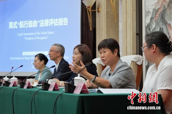 8月25日,中國自然資源部海洋發(fā)展戰(zhàn)略研究所在北京發(fā)布《美式“航行自由”法律評估報告》中英文版。該《報告》旨在對美國“航行自由”相關(guān)主張和實踐是否符合國際條約和一般國際法、是否具備法律基礎(chǔ)進行評估。圖為自然資源部海洋發(fā)展戰(zhàn)略研究所前所長張海文(右二)答記者問。中新社記者 張祥毅 攝
