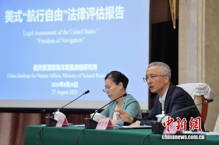 8月25日,中國自然資源部海洋發(fā)展戰(zhàn)略研究所在北京發(fā)布《美式“航行自由”法律評估報告》中英文版。該《報告》旨在對美國“航行自由”相關(guān)主張和實踐是否符合國際條約和一般國際法、是否具備法律基礎(chǔ)進行評估。圖為上海交通大學(xué)日本研究中心副教授鄭志華(右)答記者問。中新社記者 張祥毅 攝