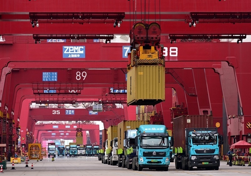 8月26日,貨運(yùn)卡車在山東港口青島港前灣港區(qū)碼頭運(yùn)送集裝箱。