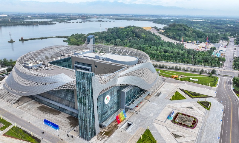 這是8月28日在寧夏銀川市拍攝的第七屆中國—阿拉伯國家博覽會開幕式舉辦地——寧夏國際會堂外景(無人機照片)。