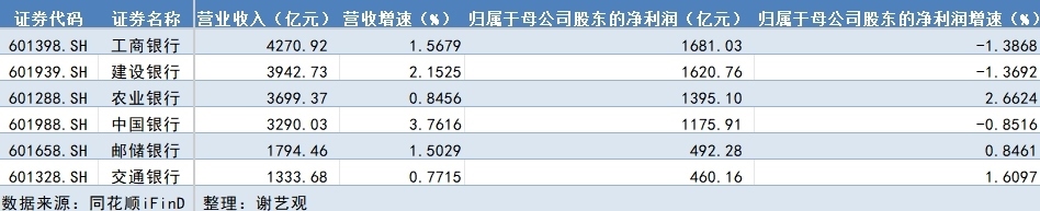 具體來(lái)看,農(nóng)業(yè)銀行、交通銀行、郵儲(chǔ)銀行實(shí)現(xiàn)營(yíng)收和凈利潤(rùn)指標(biāo)雙增,但工商銀行、建設(shè)銀行、中國(guó)銀行歸屬于母公司股東的凈利潤(rùn)同比有所下降,降幅分別為1.39%、1.37%和0.85%。