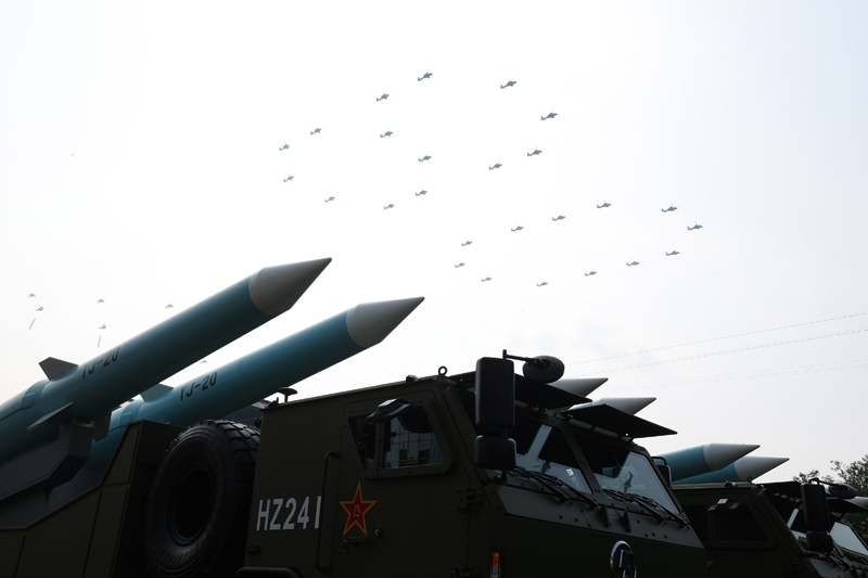 9月3日,紀念中國人民抗日戰(zhàn)爭暨世界反法西斯戰(zhàn)爭勝利80周年大會在北京隆重舉行。這是空中護旗梯隊從反艦導(dǎo)彈方隊上空飛過。