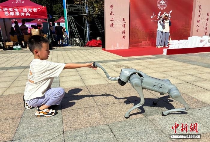 9月2日,山東濟(jì)南,一名小朋友在山東大學(xué)迎新現(xiàn)場(chǎng)和四足機(jī)器人握手。高藝芯 攝