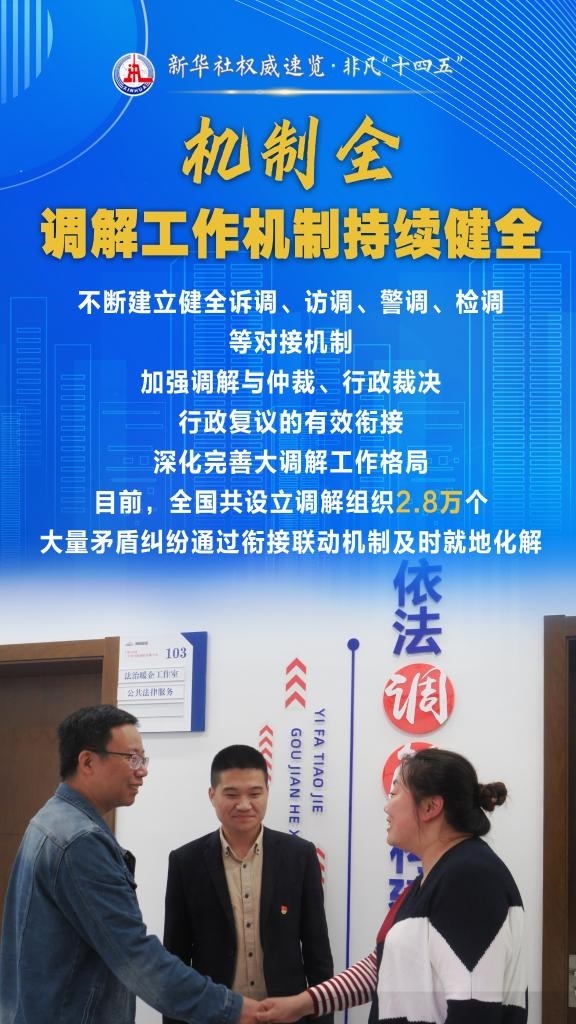 “十四五”期間,司法部堅持和發(fā)展新時代“楓橋經(jīng)驗”,充分發(fā)揮調(diào)解職能作用,以“機(jī)制全、領(lǐng)域廣、隊伍強(qiáng)、效果實”十二字為工作“秘訣”,大力加強(qiáng)矛盾糾紛排查化解,切實保障群眾合法權(quán)益,維護(hù)社會和諧穩(wěn)定。