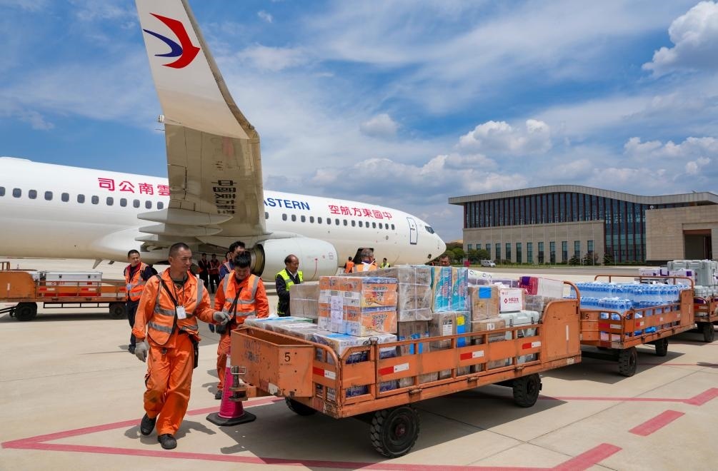 這是2025年4月19日在昆明長水機場拍攝的中國政府援緬衛(wèi)生防疫隊攜帶的物資。新華社記者 陳欣波 攝
