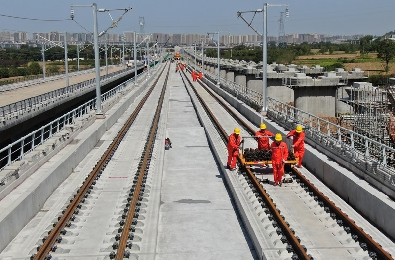 9月8日,施工車輛在西十高鐵西安東至藍(lán)田區(qū)間鋪設(shè)無縫鋼軌(無人機(jī)照片)。
