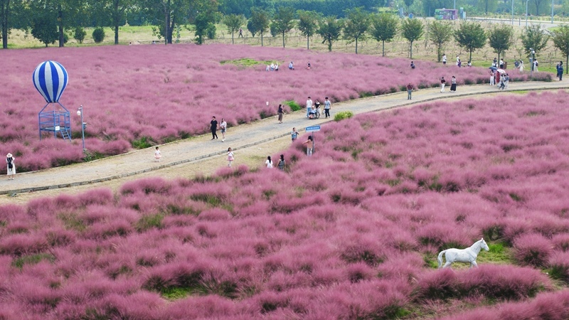 10月5日,人們在南京八卦洲陌上花渡游玩(無人機照片)。