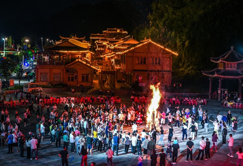 10月5日晚,在貴州省晴隆縣阿妹戚托小鎮(zhèn),游客與當?shù)厝罕妵艋鸸参琛?br/>
