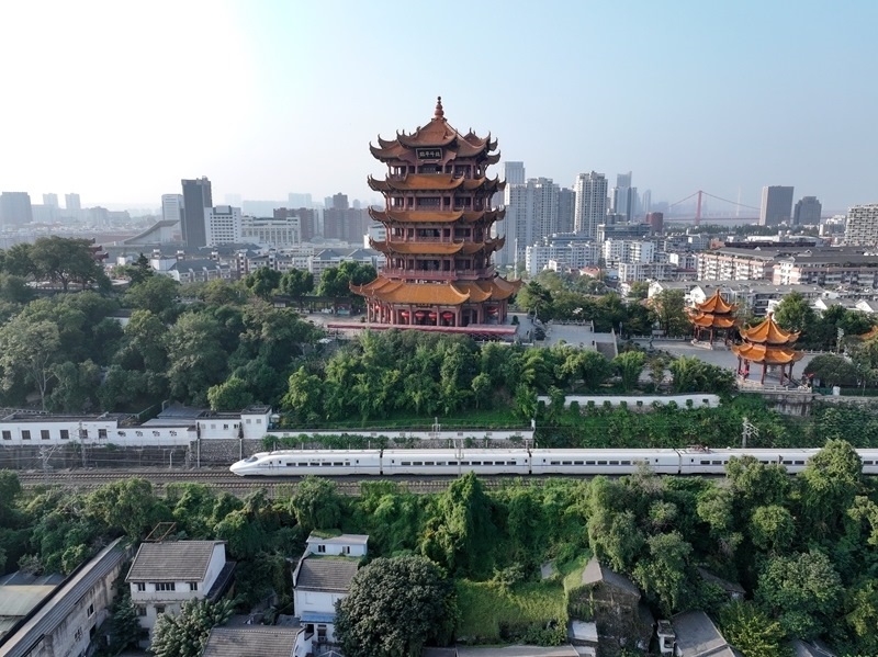 10月10日,動車組列車經(jīng)過湖北省武漢市黃鶴樓(無人機(jī)照片)。