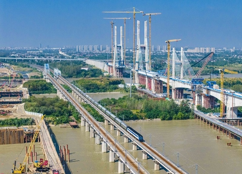10月10日,動車組列車駛出位于江蘇省南通市崇川區(qū)的南通動車所(無人機(jī)照片)。