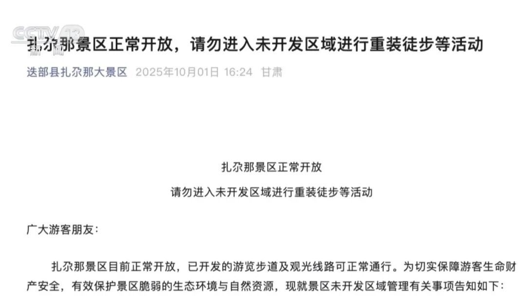 假期第一天,扎尕那景區(qū)宣布,嚴(yán)禁任何組織或個(gè)人未經(jīng)批準(zhǔn)擅自進(jìn)入其未開發(fā)區(qū)域開展重裝徒步等活動。
