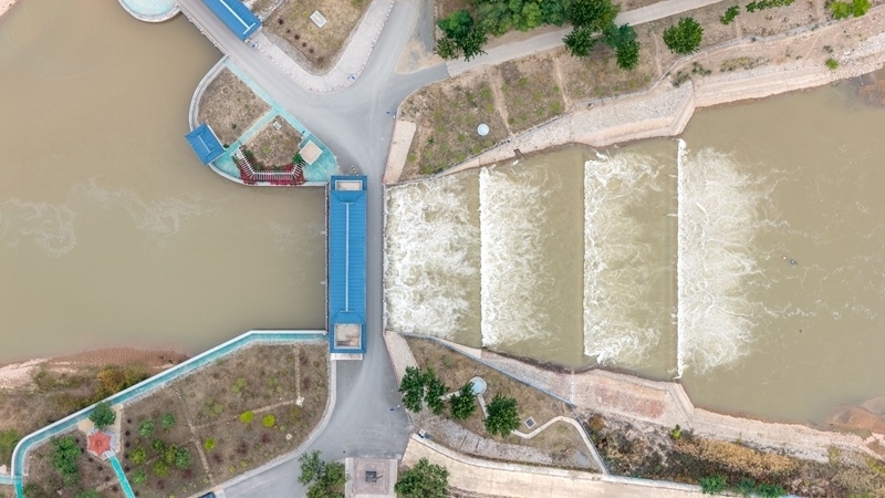 10月16日,用于灌溉的黃河水流經(jīng)內(nèi)蒙古巴彥淖爾市臨河區(qū)境內(nèi)的總干渠第二分水樞紐(無人機照片)。
