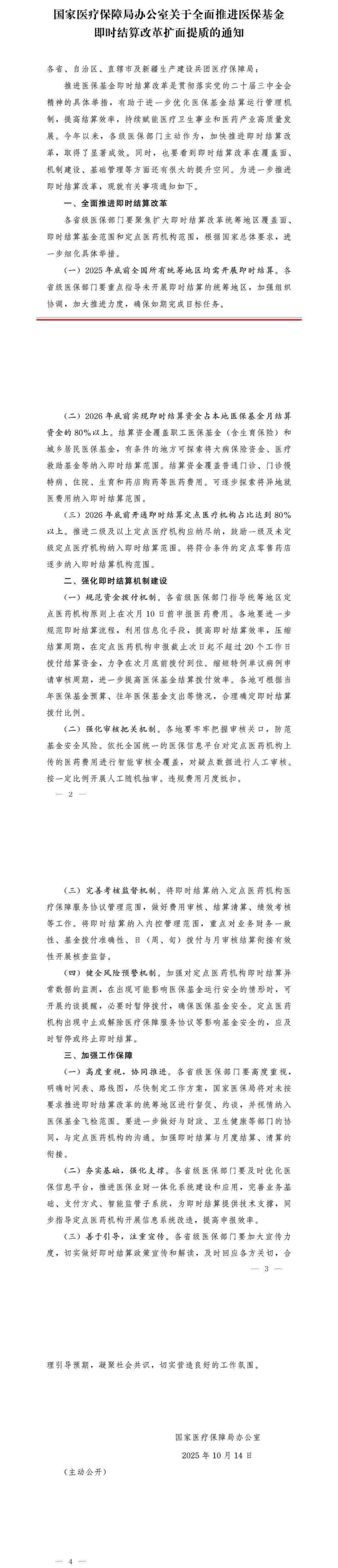 據(jù)國家醫(yī)保局官方微信消息,國家醫(yī)療保障局辦公室發(fā)布《關(guān)于全面推進(jìn)醫(yī)保基金即時(shí)結(jié)算改革擴(kuò)面提質(zhì)的通知》。全文如下: