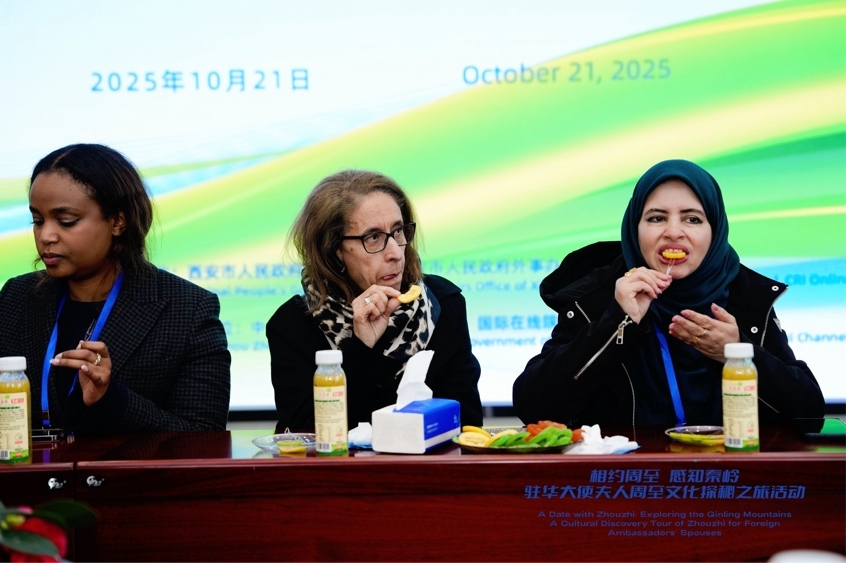 駐華大使夫人品嘗著不同品種的獼猴桃以及各式各樣的獼猴桃深加工食品,紛紛稱贊其細膩的口感、獨特的風味和濃郁的果香。“這不僅是一次味覺的享受,更是一次對中國鄉(xiāng)村產(chǎn)業(yè)振興的直觀感受?!蹦β甯珩v華大使夫人表示,“我非常期待后續(xù)可以和周至合作,因為摩洛哥很喜歡這種水果,我也希望可以在這里學到一些產(chǎn)業(yè)發(fā)展的知識,并把這些知識帶回我們國家?!?/p>