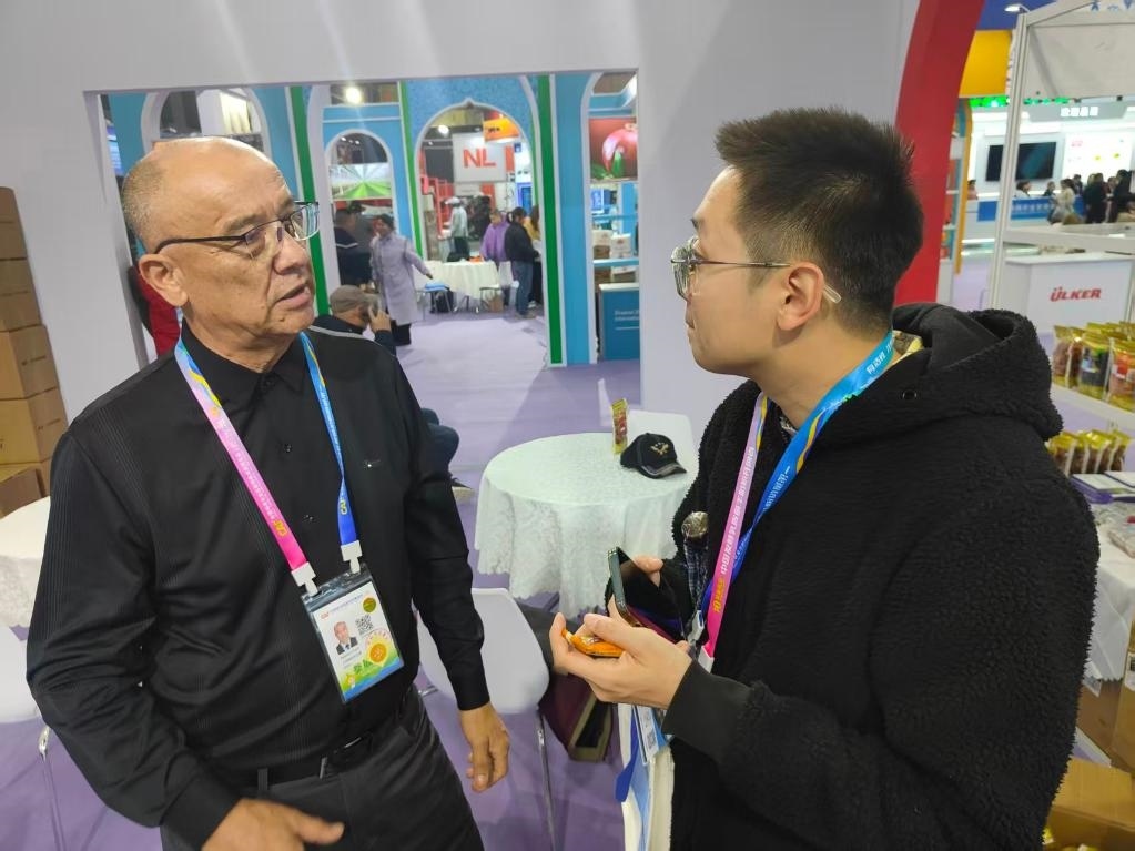 2025年10月24日,塔吉克斯坦杏和公司負(fù)責(zé)人普洛特·阿舒羅夫(左)介紹自己參加第32屆中國楊凌農(nóng)業(yè)高新科技成果博覽會的相關(guān)情況。新華社記者 姚友明 攝