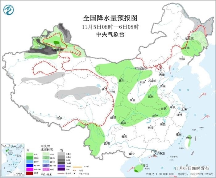 11月5日8時(shí)至6日8時(shí),新疆北部、東北地區(qū)東部、青海中部等地部分地區(qū)有小到中雪或雨夾雪,其中,新疆阿勒泰、沿天山一帶等地部分地區(qū)有大到暴雪(10~15毫米),新增積雪深度6~10厘米,部分地區(qū)15~20厘米。內(nèi)蒙古西部、西北地區(qū)東部、黃淮西部、江淮西部、江漢、西南地區(qū)東北部和西南部、海南島等地部分地區(qū)有小雨,局地有中雨。南海東南部海域?qū)⒂?0~12級(jí)、陣風(fēng)13級(jí)的風(fēng),南海西南部海域?qū)⒂?0~11級(jí)、陣風(fēng)12級(jí)的風(fēng),南海中部海域?qū)⒂?~8級(jí)、陣風(fēng)9級(jí)的風(fēng)。
