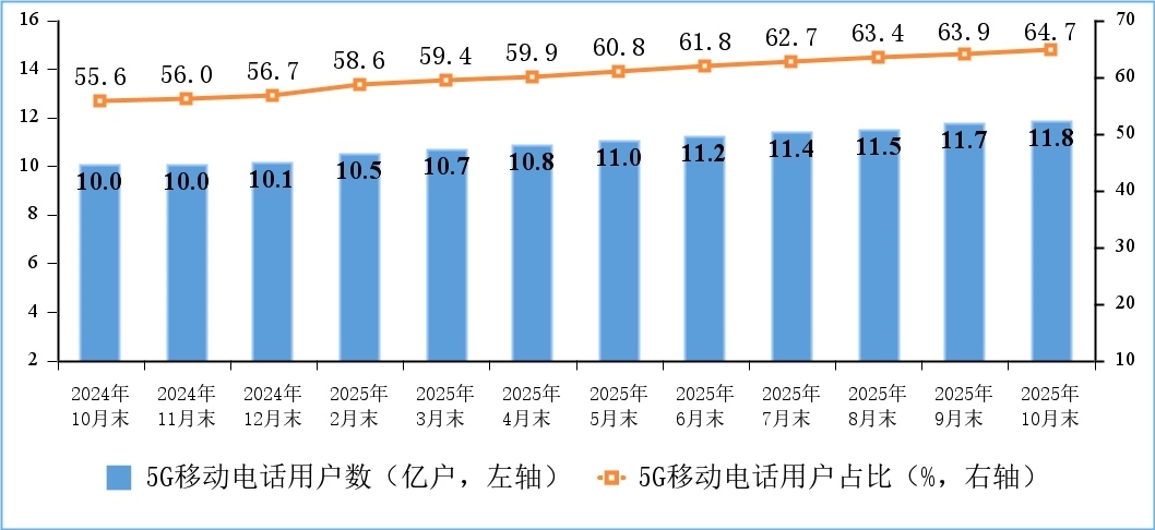 移動(dòng)電話用戶規(guī)模穩(wěn)中有增,5G用戶數(shù)持續(xù)增加。截至10月末,三家基礎(chǔ)電信企業(yè)及中國(guó)廣電的移動(dòng)電話用戶總數(shù)達(dá)18.3億戶,比上年末凈增4015萬戶。其中,5G移動(dòng)電話用戶達(dá)11.84億戶,比上年末凈增1.7億戶,占移動(dòng)電話用戶的64.7%。
