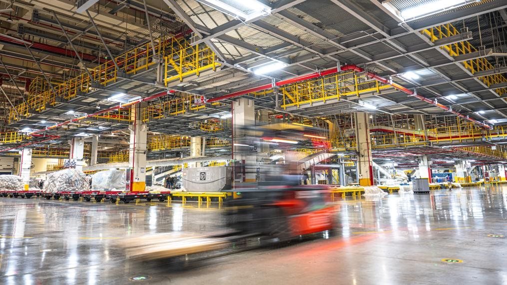 跟隨轉(zhuǎn)運(yùn)車,記者來到了建筑面積達(dá)75萬平方米的機(jī)場“工”字形轉(zhuǎn)運(yùn)中心。這里,“快點(diǎn)、快點(diǎn)”的催促聲與機(jī)器有節(jié)律的運(yùn)行聲形成交響,在2萬多臺自動分揀設(shè)備和50多公里長傳送帶的支持下,工人們熟練地將數(shù)量規(guī)格不一的包裹抱起、分類、組合、打包,再拼裝出多個(gè)符合航空貨運(yùn)規(guī)格和形狀要求的大包裹。