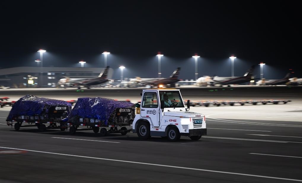 子夜時(shí)分,記者驅(qū)車來到這座機(jī)場時(shí),撲面而來的是一派“不夜空港”的繁忙景象:雪亮的停機(jī)坪上,貨機(jī)剛一停穩(wěn),工作人員便操控牽引車、加油車、轉(zhuǎn)運(yùn)車簇?fù)矶?,卸貨、加油、檢查,井井有條,一刻也不耽誤。