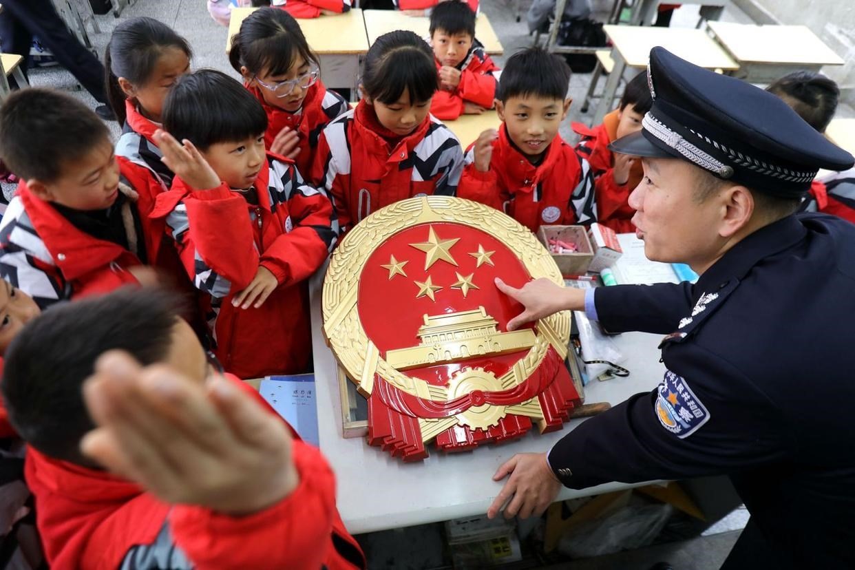 12月4日,民警在江蘇省泰州市海陵區(qū)九龍實(shí)驗(yàn)學(xué)校給學(xué)生講解憲法知識(shí)。當(dāng)?shù)?,通過(guò)咨詢、普法課堂等多種形式開展憲法宣傳教育活動(dòng),弘揚(yáng)憲法精神,提升公民法治素養(yǎng)。(工人日?qǐng)?bào)通訊員 湯德宏 攝)
