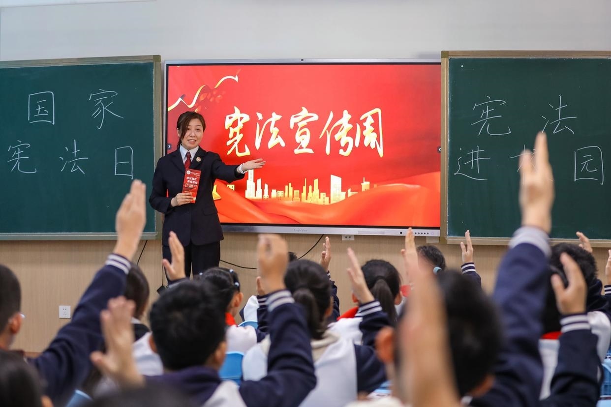 12月3日,山東省棗莊市市中區(qū)人民法院組織法官走進(jìn)校園,開展主題宣傳活動(dòng),向?qū)W生普及憲法知識(shí)、宣傳法治觀念、弘揚(yáng)憲法精神。(工人日?qǐng)?bào)通訊員 孫中喆 攝)