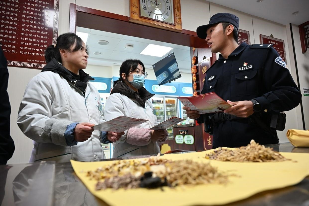 12月2日,安徽省馬鞍山市含山縣公安局林頭派出所聯(lián)合鎮(zhèn)司法所,將“法治課堂”搬進(jìn)菜市場(chǎng)門口,向過(guò)往群眾講解《中華人民共和國(guó)憲法》《中華人民共和國(guó)民法典》等法律法規(guī)。(工人日?qǐng)?bào)通訊員 馮善軍 攝)