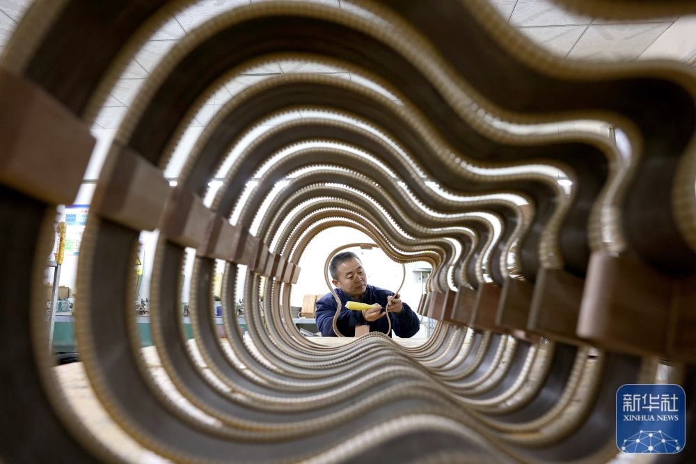 ↑ 12月15日,在山東省棗莊市市中區(qū)孟莊鎮(zhèn)一家吉他生產(chǎn)企業(yè),技術(shù)工人在生產(chǎn)吉他。新華社發(fā)(孫中喆攝)