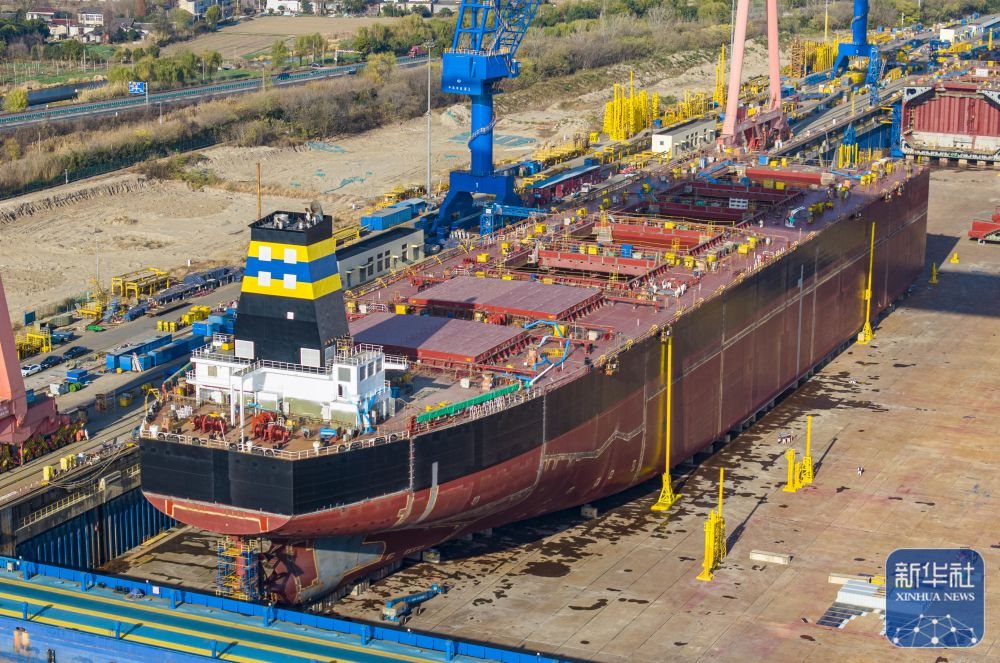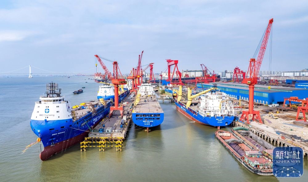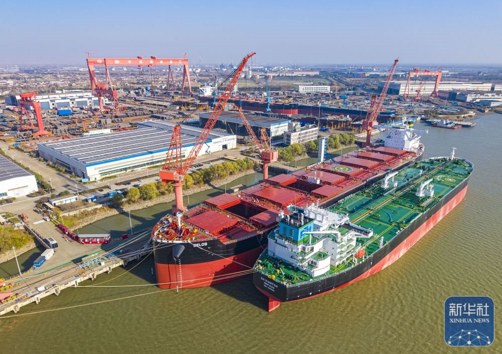 ↑ 這是12月14日拍攝的位于江蘇省江都經(jīng)濟(jì)開(kāi)發(fā)區(qū)的揚(yáng)州中遠(yuǎn)海運(yùn)重工有限公司生產(chǎn)廠區(qū)(無(wú)人機(jī)照片)。新華社發(fā)(任飛攝)