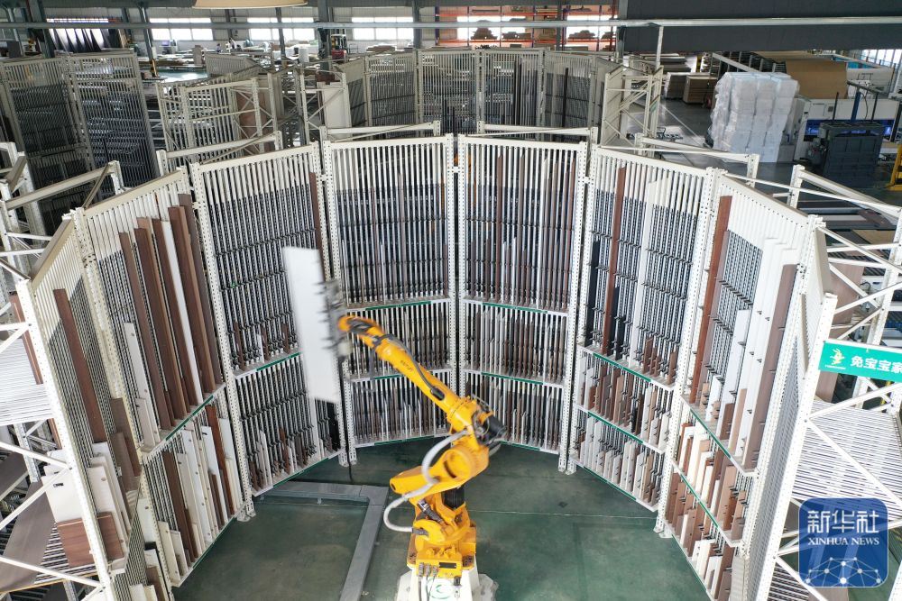 ↑ 12月15日,在位于浙江省湖州市德清縣乾元鎮(zhèn)的德華兔寶寶裝飾新材股份有限公司家居產(chǎn)業(yè)園,智能分揀機(jī)械臂在分揀家具板材(無(wú)人機(jī)照片)。新華社發(fā)(倪立芳攝)