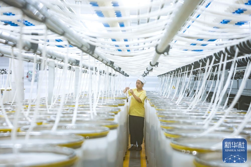 ↑ 12月15日,工人在江蘇省泰州市姜堰區(qū)三水街道江蘇泰達(dá)紡織科技有限公司智慧紡紗車間忙碌作業(yè)。新華社發(fā)(顧繼紅攝)