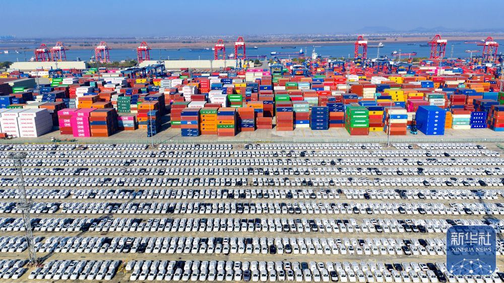 ↑ 12月14日在江蘇省港口集團(tuán)南京港龍?zhí)都b箱碼頭拍攝的等待裝船出口的國(guó)產(chǎn)汽車(無(wú)人機(jī)照片)。新華社發(fā)(楊素平攝)