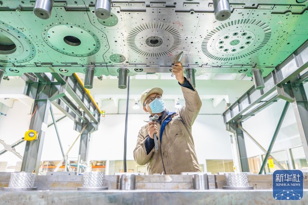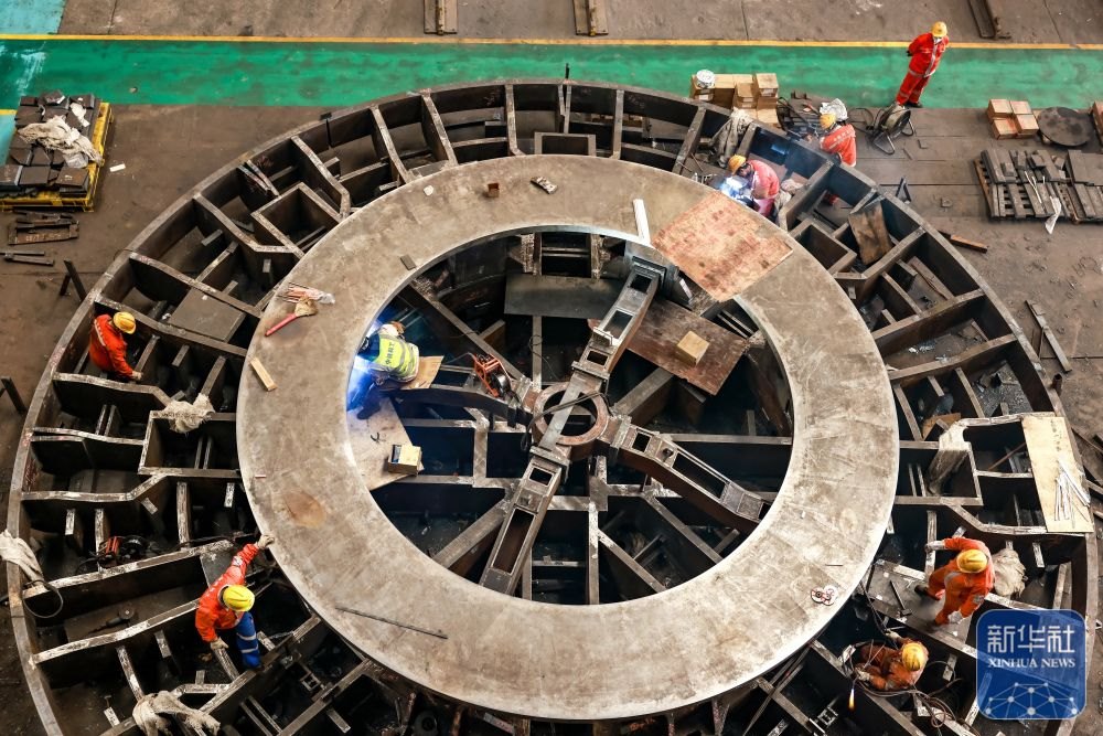↑ 12月15日,中鐵科工集團(tuán)武漢江夏制造基地技術(shù)工人對(duì)盾構(gòu)機(jī)配件進(jìn)行裝配作業(yè)。新華社發(fā)(趙軍攝)
