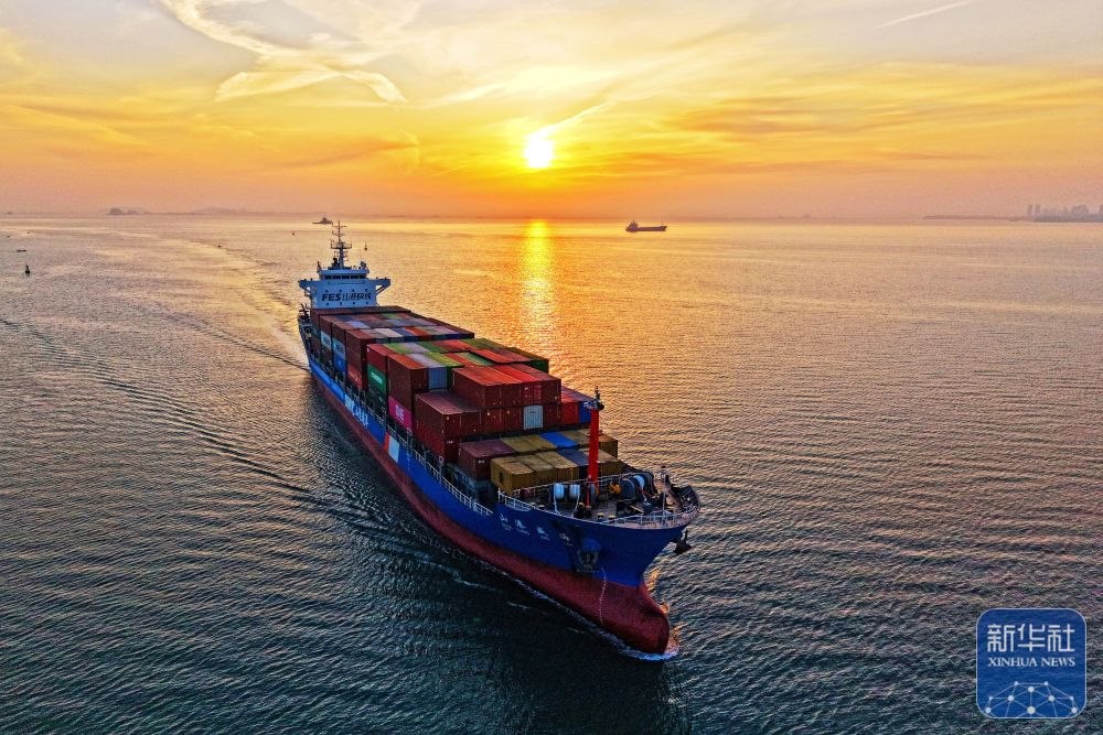 ↑ 12月15日,一艘集裝箱貨輪駛?cè)肷綎|港口煙臺(tái)港(無(wú)人機(jī)照片)。新華社發(fā)(孫文潭攝)