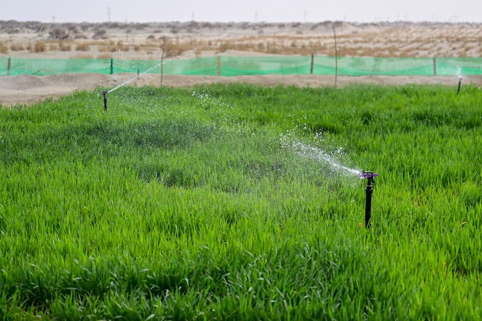 2025年4月13日,新疆阿克蘇地區(qū)沙雅縣沙生經(jīng)濟作物發(fā)展試驗基地,經(jīng)過苦咸水淡化技術處理的地下水噴灌出的小麥長勢良好。新華社記者丁磊 攝