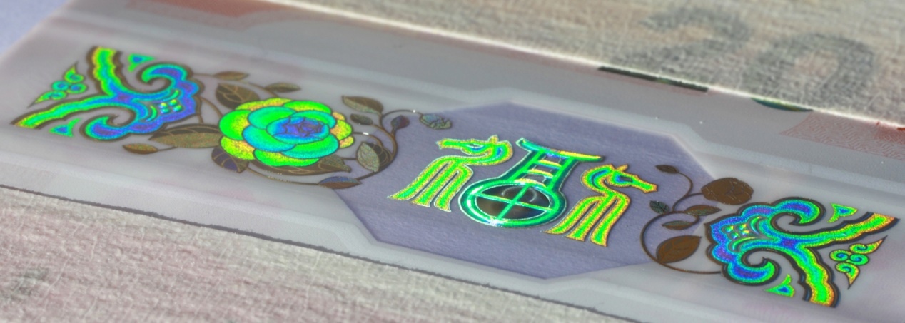 位于票面下方。票面背面可見“八方花窗”內(nèi)“?!弊盅b飾紋樣呈現(xiàn)金色效果。防偽特征效果見圖7。
