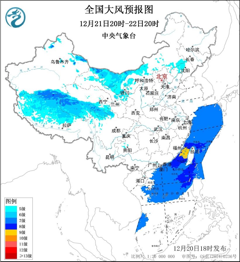 12月21日20時至22日20時,內(nèi)蒙古中西部、東北地區(qū)南部、華北北部、新疆北疆東部、西藏北部、青海中南部等地有5~6級風,陣風7~9級;東海大部海域、臺灣海峽、臺灣以東洋面、巴士海峽、南海北部和中部海域?qū)⒂?~8級、陣風9~10級的大風,其中臺灣海峽的風力可達9級、陣風10~11級。