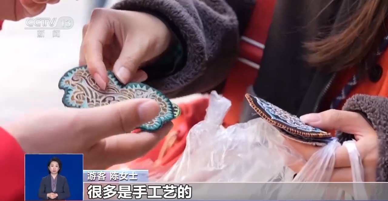 游客 陳女士:就買了一個包、一幅畫,然后還有兩個貼片。很多是手工藝的。