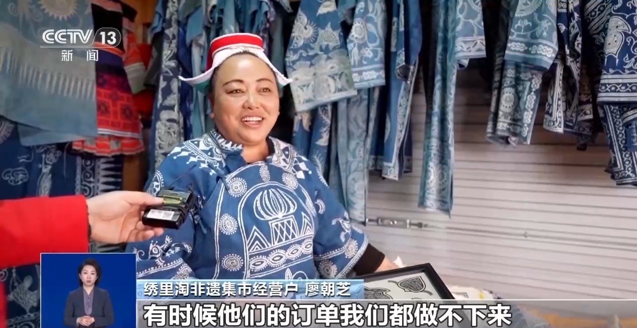 繡里淘非遺集市經(jīng)營戶 廖朝芝:我們家主要是賣蠟染。顧客很喜歡,有時候給我們介紹訂單,有時候他們的訂單我們都做不下來。
