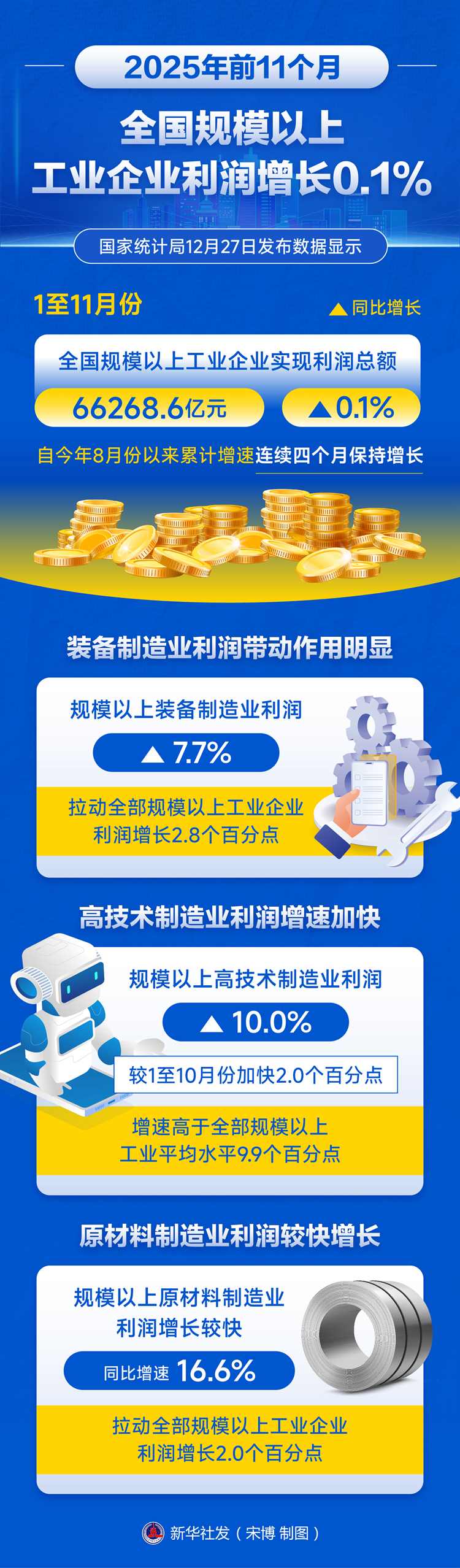 新華社北京12月27日電(記者王雨蕭)國家統(tǒng)計(jì)局27日發(fā)布數(shù)據(jù)顯示,1至11月份,全國規(guī)模以上工業(yè)企業(yè)實(shí)現(xiàn)利潤總額66268.6億元,同比增長(zhǎng)0.1%,自今年8月份以來累計(jì)增速連續(xù)四個(gè)月保持增長(zhǎng)。