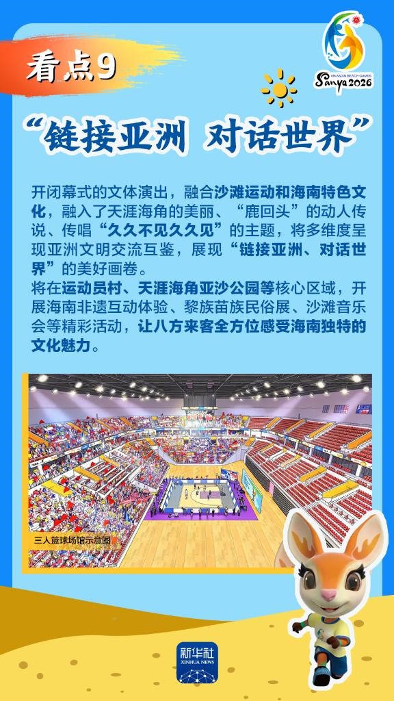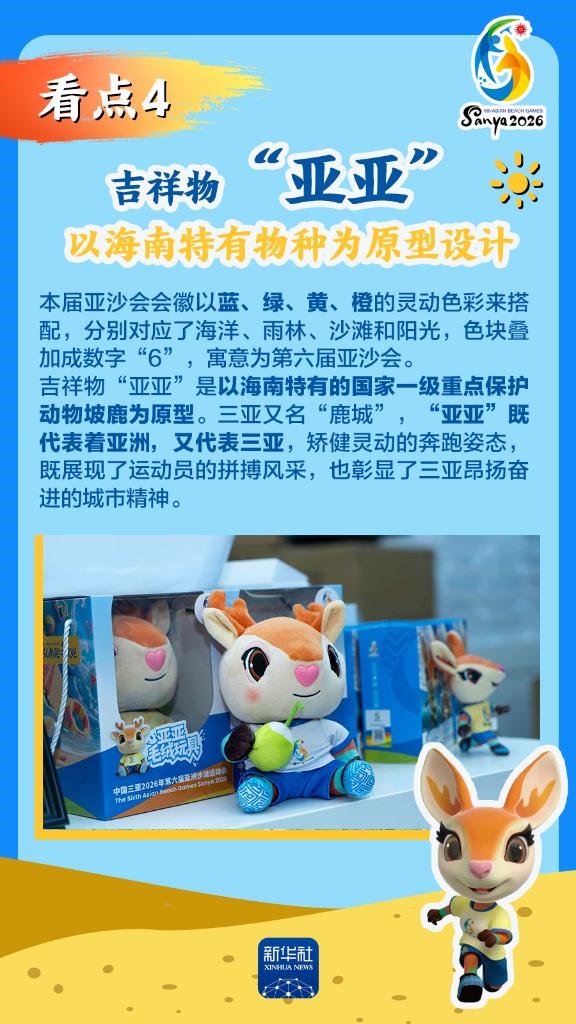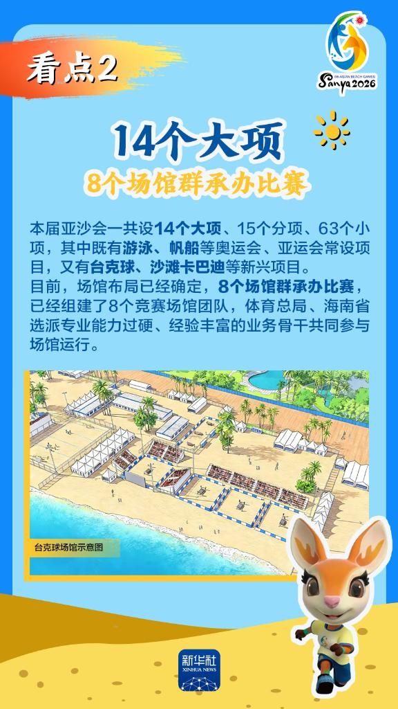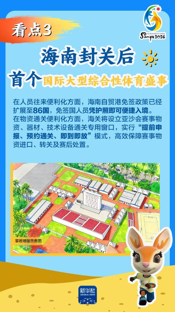 第六屆亞洲沙灘運(yùn)動(dòng)會(huì)(以下簡(jiǎn)稱“亞沙會(huì)”)將于2026年4月22日至30日在海南三亞舉行,賽事歷時(shí)9天。作為海南自由貿(mào)易港封關(guān)運(yùn)作后迎來(lái)的首個(gè)國(guó)際大型綜合性體育盛事,亞沙會(huì)都有哪些看點(diǎn)?為何值得期待?國(guó)新辦12日發(fā)布會(huì)做了詳細(xì)介紹,一起來(lái)看。