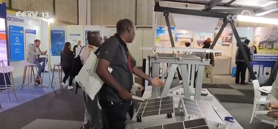 這個新能源產(chǎn)品可以說是非常具有非洲特色,它的上面是兩片光伏板,下面是兩個可以調(diào)整角度的攝像頭,用光伏發(fā)電來支持攝像頭的運行,還有把路燈、攝像頭和光伏結合在一起的。