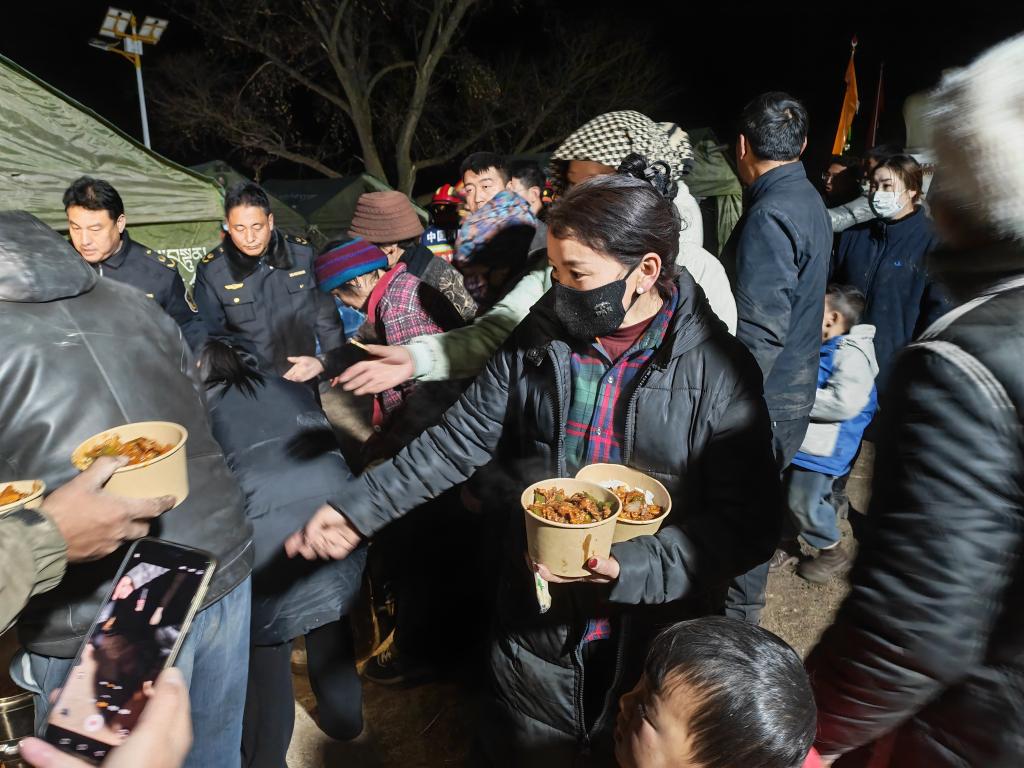 1月26日晚,在甘南州迭部縣電尕鎮(zhèn)哇曲村臨時(shí)安置點(diǎn),群眾正在領(lǐng)取愛(ài)心餐食。(新華社記者崔翰超 攝)
