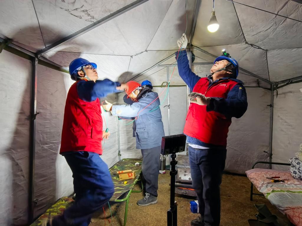 1月26日晚,國(guó)網(wǎng)甘南供電公司工作人員為臨時(shí)安置點(diǎn)應(yīng)急帳篷接電。(國(guó)網(wǎng)甘南供電公司供圖)